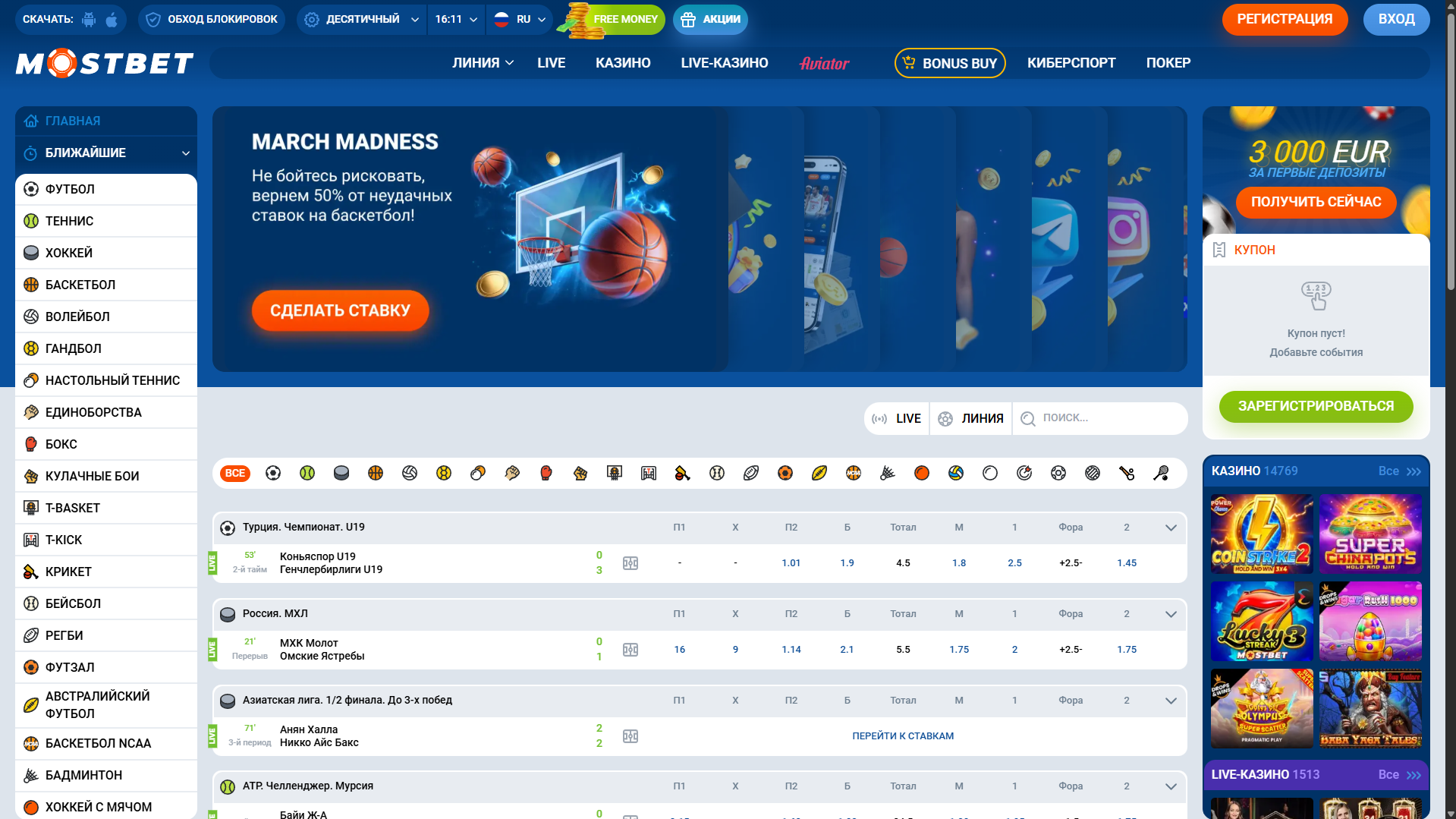Одна из главных причин популярности Мостбет — широкая спортивная линия. На платформе доступны как наиболее востребованные дисциплины, так и менее популярные направления. Пользователи могут выбирать между прематч-ставками и live-режимом.